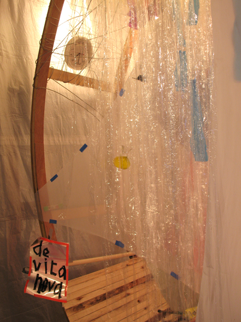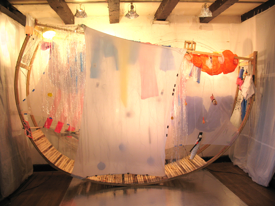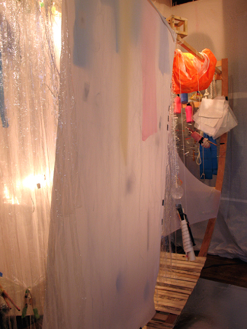 Wood, spandex, transparent plastic film, nylon poly-twine, paper drop cloth, steel wire, aluminum sheets, rolled pristine canvas, brushes, oil color tubes, acrylic color bottles, a bag of colored sand, a length of heavy nylon rope, lots of blank paper sheets, music score sheets, a recorder, percussion devices, a wall-clock, a few telescopic lenses. A jar of sacramental oil. A lamp, and other lights.