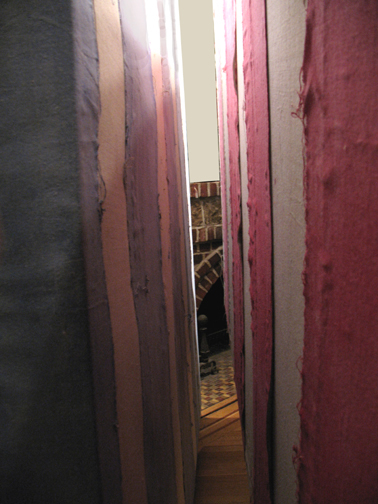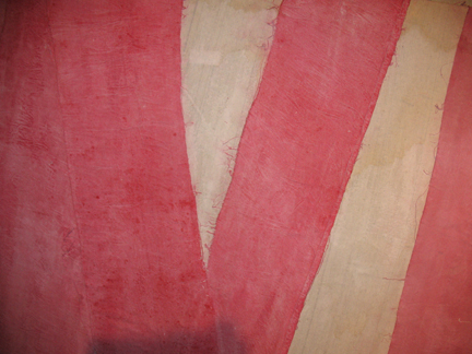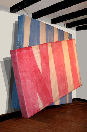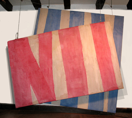 Dyed canvas strips glued on canvas, pulleys,